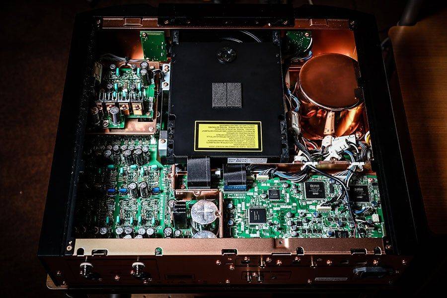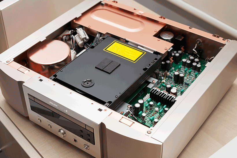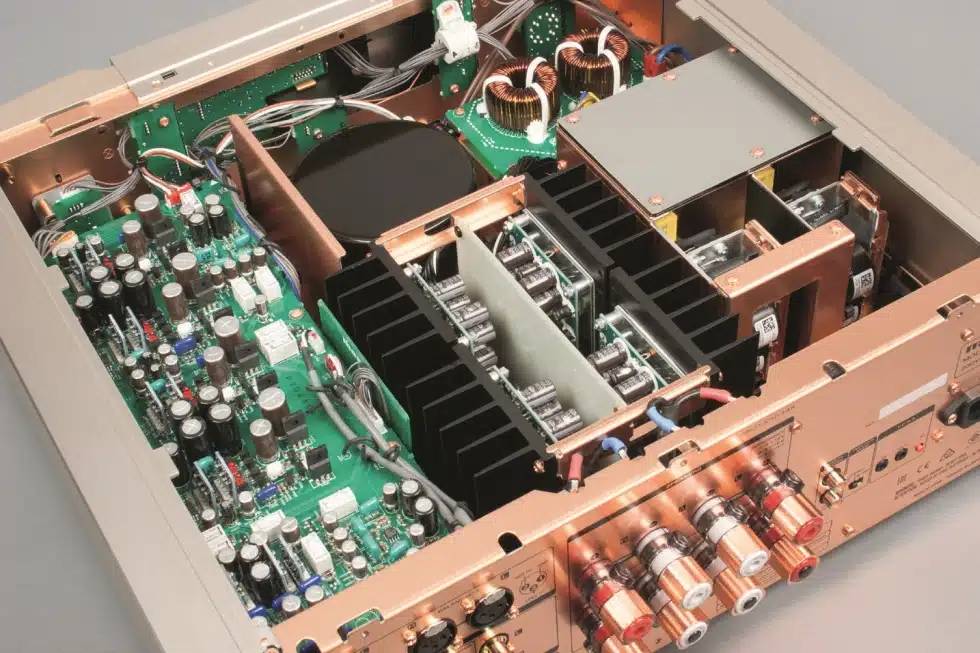 该放大器拥有高达2 x 200 W 的标称输出功率(8 欧姆),当负载阻抗降至 4 欧姆时,输出功率翻倍。输出级为 D 类。安装印刷电路板的放大器框架采用镀铜处理。电路由铜屏蔽层隔开。输出板和电源上的走线厚度加倍。线路级使用 HDAM SA3(超级动态放大器模块)模块。均衡前级放大器采用独立的HDAM SA3 电路。HDAM 的开发源于 Marantz 工程师对大众市场制造商提供的运算放大器的不满。由于无法从这些放大器中获得理想的音质,他们决定自行设计。信号路径还采用了 Elna Silmic 和 Elna Cerafine 电容器以及 MELF 电阻器(无引出线连接),这些电阻器需要特殊焊接,但据设计师称,它们更耐用。