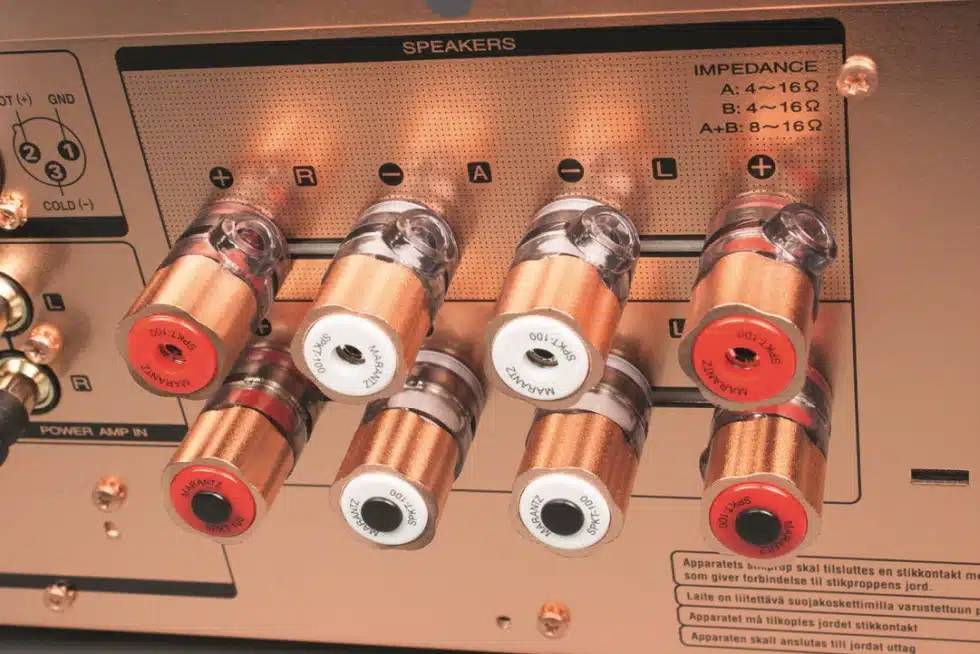 后面板采用镀锌铜材质,确保数十年的耐用性。将设备和扬声器连接到功放时,铜不仅赏心悦目,更重要的是,它还能提供最佳屏蔽,保护内部电路免受有害电磁场的影响。扬声器端子采用双线设计,方便双线连接。这些设计是马兰士独创的。SPKT-100+ 采用纯铜材质,可连接香蕉插头、叉形插头和裸线。后面板还配有遥控器插孔,用于在马兰士组件之间传输命令,只需一个按钮即可开启和关闭设备。立体声/双功放开关可更改功率放大器的工作模式。FCBS(浮动控制总线系统)插孔最多可连接四台马兰士功放,从而组建多声道系统。