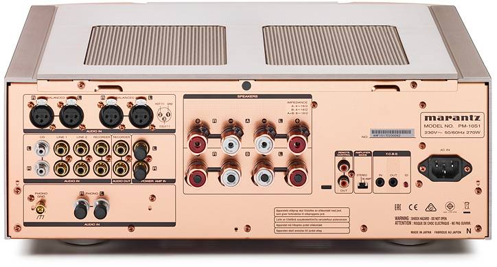 机箱由厚实的铸铝面板制成。厚网状方形风扇占据了机盖的很大一部分。支脚由铸铝制成,背面覆盖有薄毡。后面板具有两个XLR 线路电平输入和四个 RCA 输入。用于 CD 播放器的输入更大,由镀铑铜制成。其他输入也同样美观且坚固。附加环路可用于连接磁带录音机等设备。还有一个直接连接到后级放大器的RCA 输入(功率放大器输入)。遗憾的是没有配备双 XLR。考虑到唱机用户,Marantz 为 PM-10 配备了 MM/MC 输入。它也使用镀铑 RCA 插孔,就像 CD 播放器一样。唱头类型(MM、MC Low、MC High)通过遥控器选择。放大器附带用于唱机输入和输出放大器输入的插头。这些插头有助于减少干扰和 EMI/RFI 噪声。