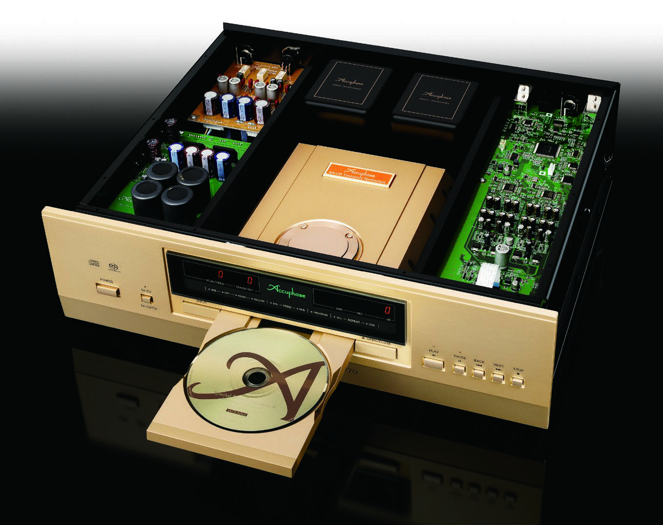 中间后方就是两只大变压器,有金属壳作屏蔽。前方就是雷射拾讯组合,是Accuphase独家的精密制作。现在还能自己制造雷射拾讯组合的厂家,买少见少了,而且似乎都是日本那几间,包括Esoteric和Accuphase。前者曾有一段时期也向其他HiEnd厂出售他们的拾讯组合,后来也停止了;Accuphase则从来没有向外出售过。因此,要CD/SACD机拥有这样精密设备的,只能求诸原厂了。