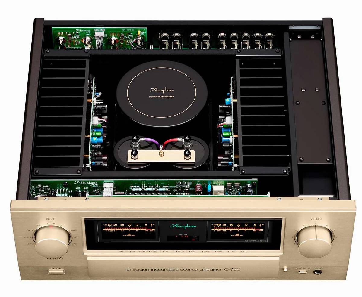 据介绍,新品E-700是第六代Accuphase甲类合并放大器E-650的后继型号,同时也融合了厂方50周年旗舰型号E-800的众多技术,这是Accuphase革命性的合并放大器新品。E-700其外形和尺寸似乎和E-650无异,要看E-700的提升还是得从内部入手。厂方为其投入了最新的电路和高级材料,从而大幅提升了性能和音质,使其比前一代机型E-650更接近旗舰型号E-800的性能与音质。深入一点看,在E-700的前级放大部分,采用了Accuphase引以为傲的独家平衡AAVA音量控制技术(Accuphase Analog Vari-gain Amplifier)。该电路通过从输入信号中创建大小不同的多个信号,通过切换这些信号的组合来调节音量,进一步实现了AAVA的平衡化。并实现了从输入端子到输出端子的信号流完全平衡的构造,而据称高纯度的信号传输可实现高质量的音乐播放。左右声道分离的设计,也奠定了高声道分离度的基础。