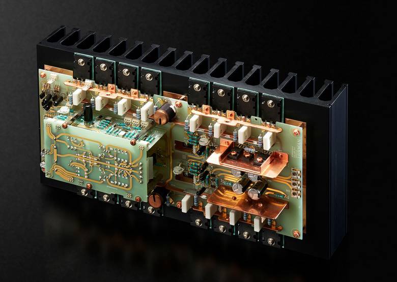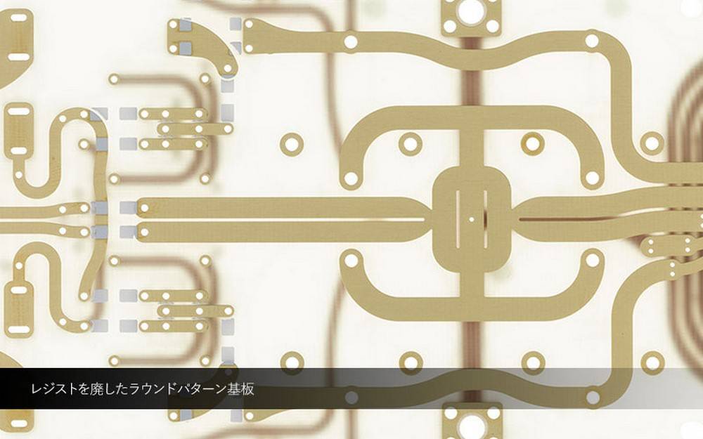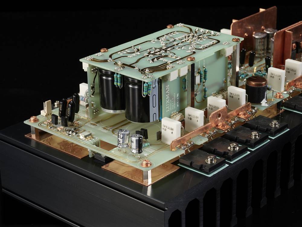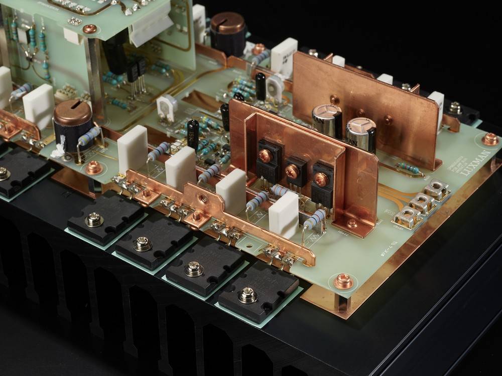 鉴于PCB 印刷电路板上铜迹的图案,对于电介效应、不必的电阻及杂散电容现象有显著影响,规划及绘制不当可引致「衰」声、讯号质素下降。故Luxman 慷慨地以厚达100μm 铜箔再加上镀金处理,并选用去除阻焊涂层的印刷电路板,以消除抗蚀剂对音质所引致不良影响之同时,同一道音频电路上铜迹的规划,亦力求对称、宽度均等,也无转向太急、太曲折的棱角。最终绘制出看上去弯弯曲曲、实则柔和地转弯的铜迹图案及布局,以促进讯号平顺流动,从而抑制上述影响。