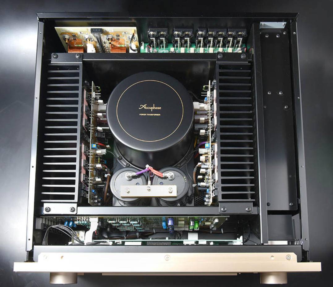 E-800S 采用了与最新的A-48S 纯A 类立体声后级相同的极低输出阻抗功率放大引擎,具有六对特选电流负载力强达33A 的Fairchild MOS-FET晶体管作并联推挽输出级,大电流设计无疑对扬声器控制方面大有帮助。至于内部设计方面,E-800S沿用Accuphase一贯的工整布局,中间一只金属罩屏蔽高效巨型环牛,前方两两只定制的63.000uF大水塘(滤波电容),左右独立的放大线路设于环牛两侧呈对称式摆放,Balanced AAVA 音量控制设于最前方,典型的双单声道摆位。另外,E-800S 亦加入了独特的Balanced Remote-sensing(平衡遥距感应)技术,透过将扬声器输出端子的讯号与接地回路一同回输至放大线路末端,来进一步降低输出阻抗,如此一来就可提升阻尼系数并降低总谐波失真及互调失真。